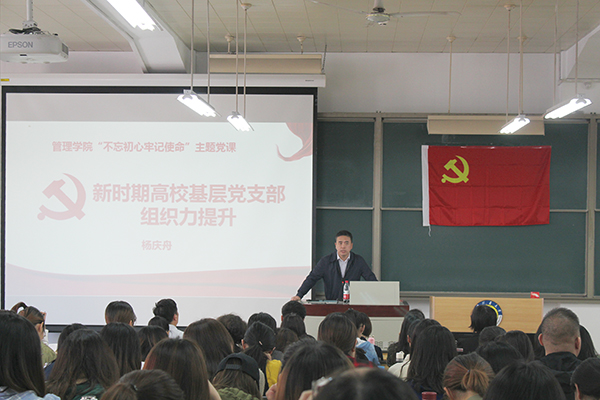 本网讯 10月8日下午,管理学院在教学楼209举办“不忘初心、牢记使命”主题教育专题党课。学院党委书记杨庆舟以《新时期高校基层党支部组织力提升》为题主讲,学院党委副书记李邦三主持。管理学院全体师生党员300余人参加了学习。