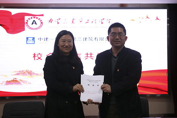 本网讯 9月13日,中国矿业大学(北京)力学与建筑工程学院与马克思主义学院赴中建一局三公司进行走访调研,力建学院与中建一局三公司签署校企合作协议,并开展中建一局三公司第一党支部与马克思主义学院教师党支部及力建博19-1党支部共建——“不忘初心、牢记使命、凝心聚力、携手前行”主题党日活动。力建学院院长左建平,马克思主义学院党总支书记李建伟,力建学院副院长宋彦琦、岳中文、吴丽丽,院党委副书记项丽娜,中建一局三公司党委副书记、纪委书记、工会主席高海娇,中建一局三公司副总经理、总工程师梅晓丽等出席本次活动。