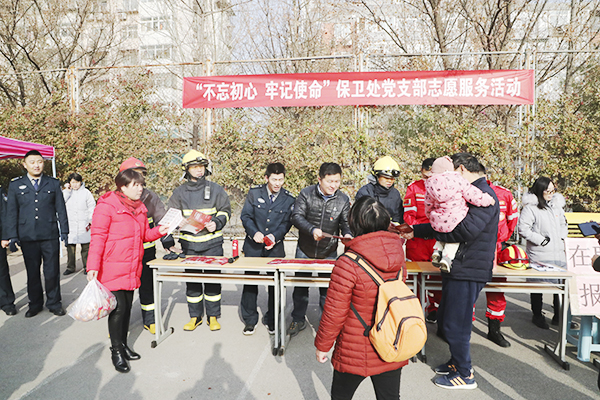 本网讯 按照保卫处党支部“不忘初心、牢记使命”主题教育推进计划的安排,12月9日,保卫处党支部全体党员来到矿大社区开展消防安全宣传和消防技能培训志愿服务活动。保卫处党支部书记、处长赵诚,社区党支部书记、主任许宏伟参加了本次活动。